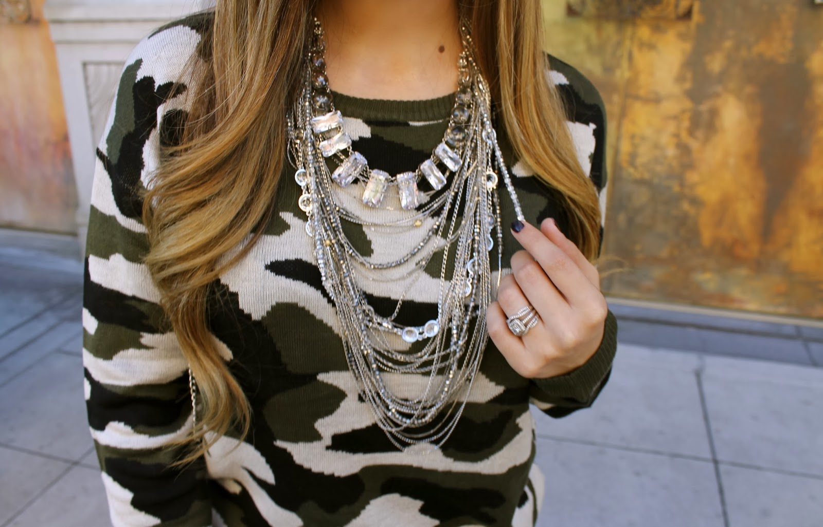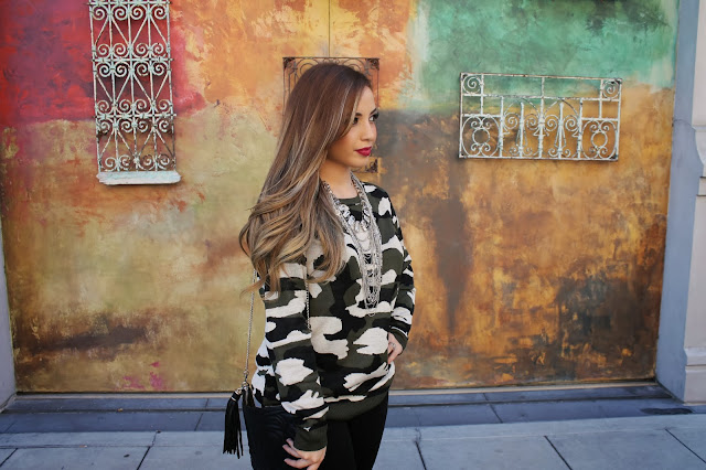 The power of a statement necklace, can make all the difference with an outfit! This is my last look for my “camo trend” theme of the week. This sweater is from Forever21, and I purchased it online. I am always a bit nervous ordering things online, but this sweater fit just right! I love loose fitting sweater during the fall/winter season, they just feel ten times more comfortable. This Henri Bendel necklace is seriously so beautiful, I received it as a gift for my birthday last year from my mother in law. I just love wearing it with either a simple top/sweater/dress to add a special spark. Also this lipstick is from Rihanna’s MAC line, called Heaux.