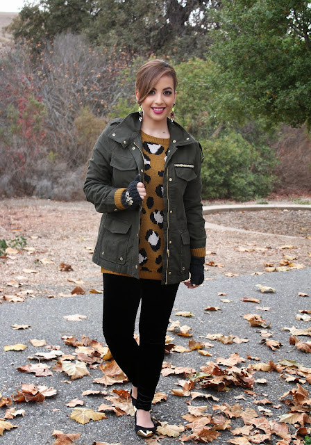 Enjoy! XoXo Sweater: Forever 21 Velvet Leggings: Forever 21 (OLD) Fingerless Gloves: Forever 21 Flats: H&M Jacket: H&M Earrings: J.Crew Lipstick: MAC REBEL Clutch: Michael Kors