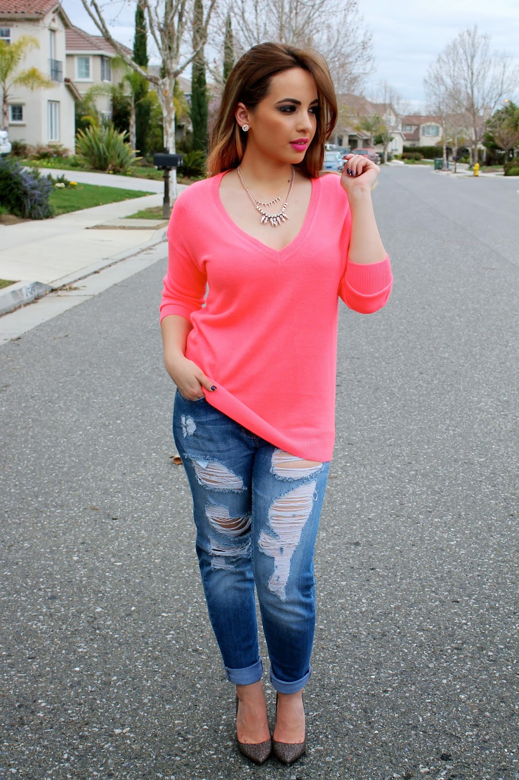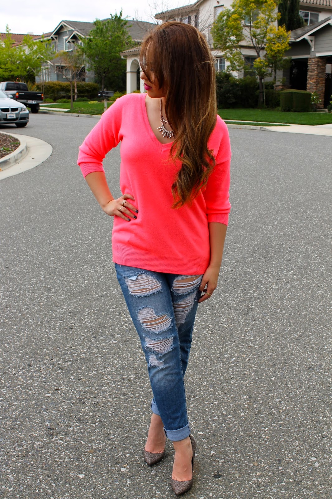 Realmente amo estos pantalones y coinciden con casi cualquier cosa! Son mi primer par de jeans boyfriend que me quedan perfectamente. Los combine con este suéter de color rosa brillante y unos tacones brillantes.
