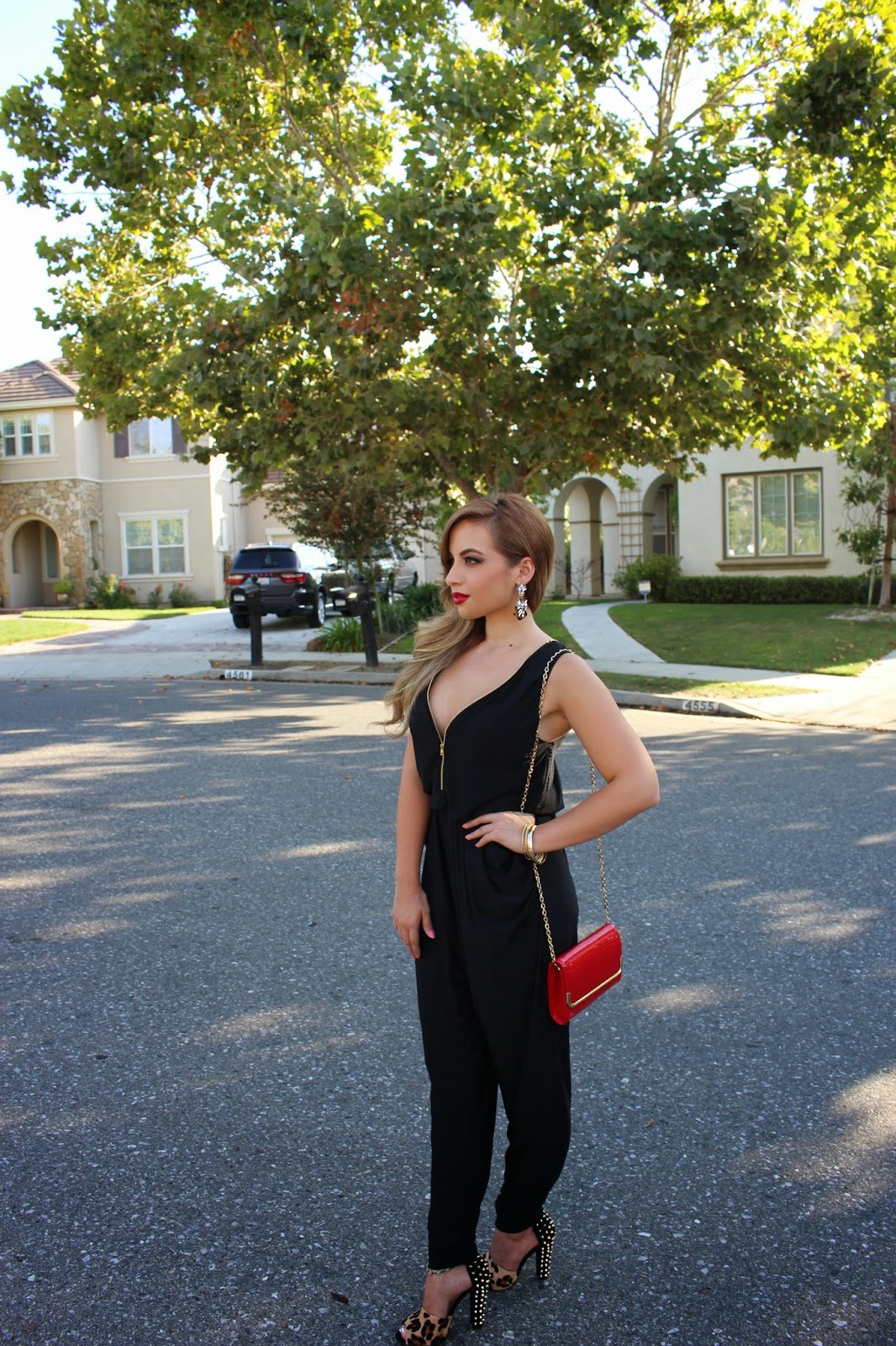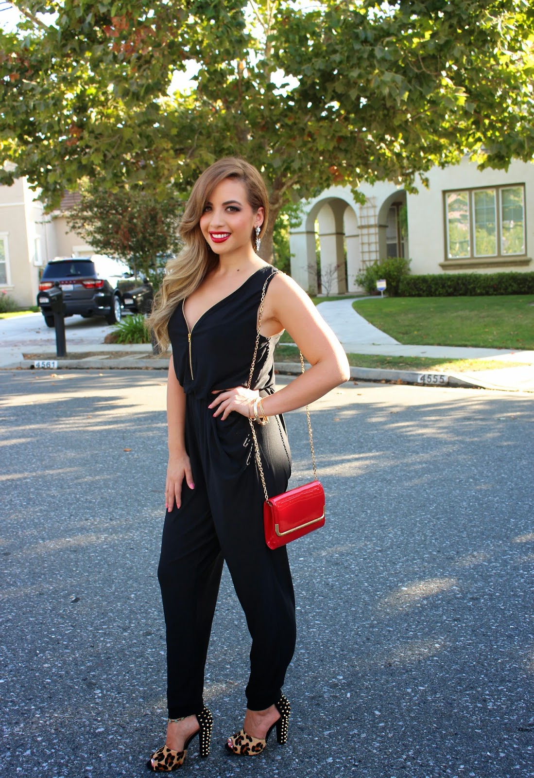 The unwritten rule when attending bachelorette parties is to wear black, so I went with a black jumpsuit. This one has has an awesome zipper in the front and back, perfect for the cooler San Francisco weather. I paired it with leopard heels, red purse and of course riri woo lipstick!