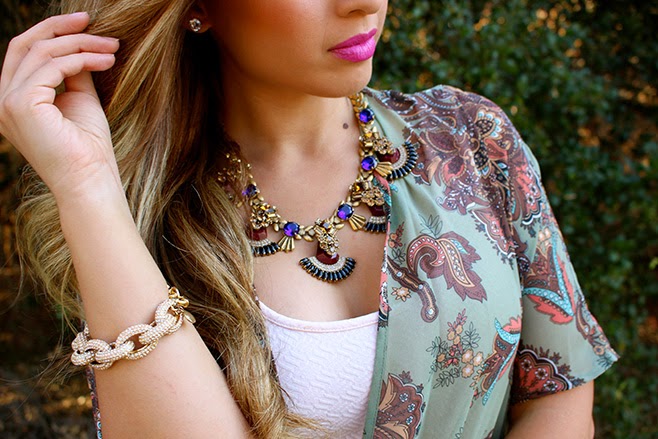 How cute is this kimono? I actually wore this outfit to dinner a few weeks ago in LA, and I wanted to re-create the look since I didn’t have time to take pictures when I wore it. Also, it’s been so hot in San Jose these past few days it doesn’t even feel like its September! A light pink dress and chunky heels are what I decided to pair this beautiful kimono with, and of course a statement necklace.