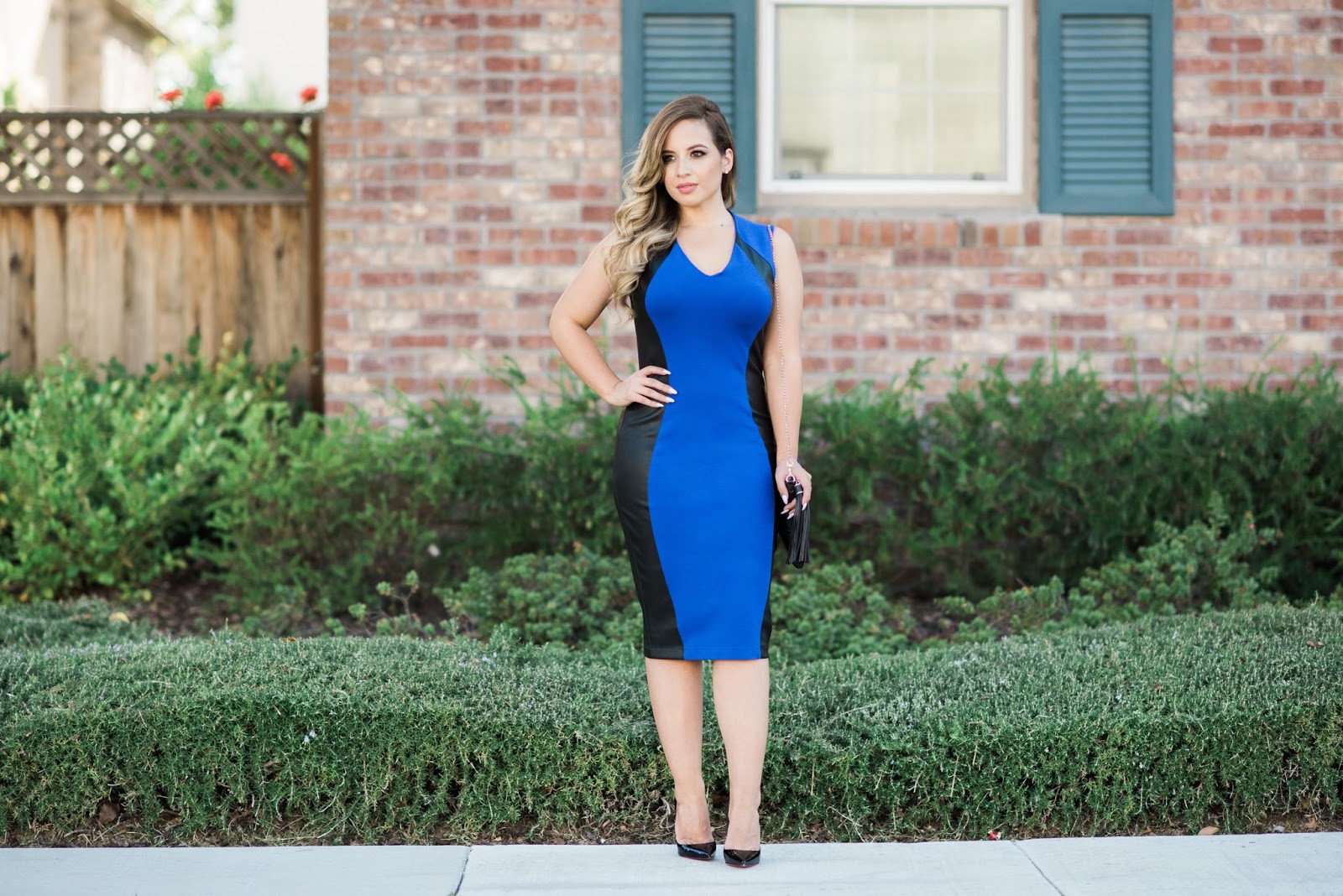 All my working ladies, you’re going to love this dress, just like I did! With us curvy women wearing form-fitting dresses can be a bit intimidating, but this dress was so flattering. It’s from the new Eva Longoria collectionavailable at The Limited. The material is thick and the faux leather gives it the perfect accent to show off your curves. Wearing a great dress brings confidence and the courage to embrace my qualities. My style is classy chic, and this dress has those elements. I love the midi length, modest V-neck and faux leather touch. You can pair it with a black blazer for work, and a leather jacket for a night out! It’s versatile enough to wear to work and for a date night! I chose to wear a statement necklace and some classy strappy heels to complete the look.