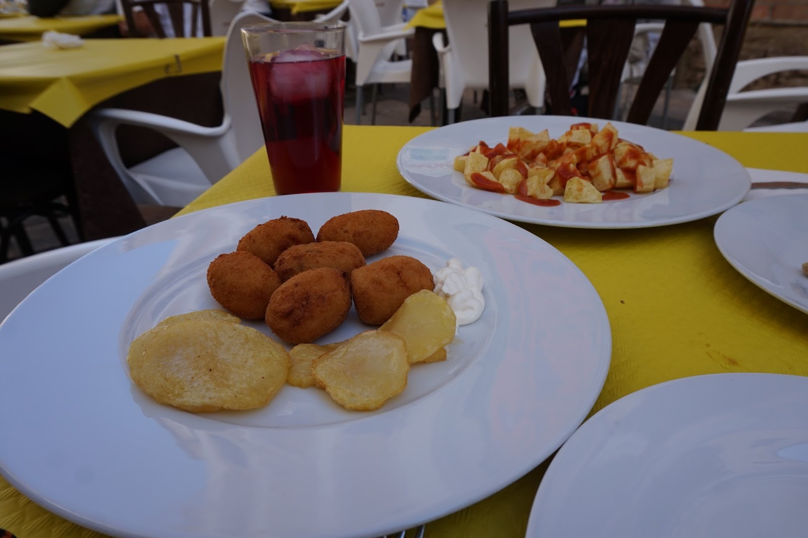 We stopped on Nueva street which was full of restaurants and bars. We chose Nueva 13 to have tapas and vino. The tapas were amazing, we especially loved the patatas bravas. They’re potatoes with a spicy sauce on top and an aioli sauce. We also ordered calamares and croquetas. I love spanish food, and croquetas are a must for me every time we eat tapas. You’ll probably be seeing them in all my food pictures. Another favorite dish is the tortilla de patatas. I’m Mexican, so in my head a tortilla is composed of either flour or corn. The tortillas in Spain are more like an omelette and this one is so simple containing just has olive oil and potatoes.