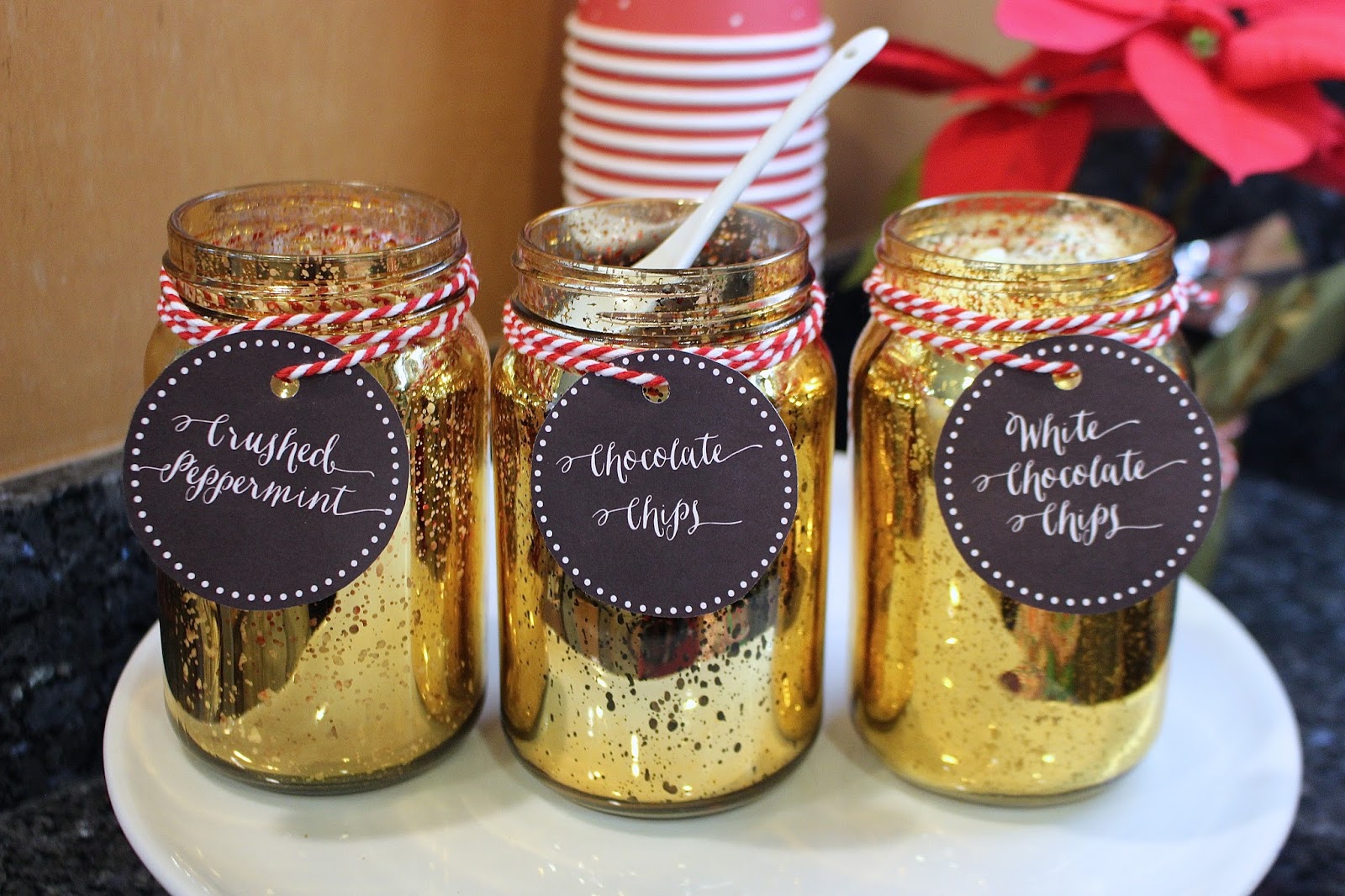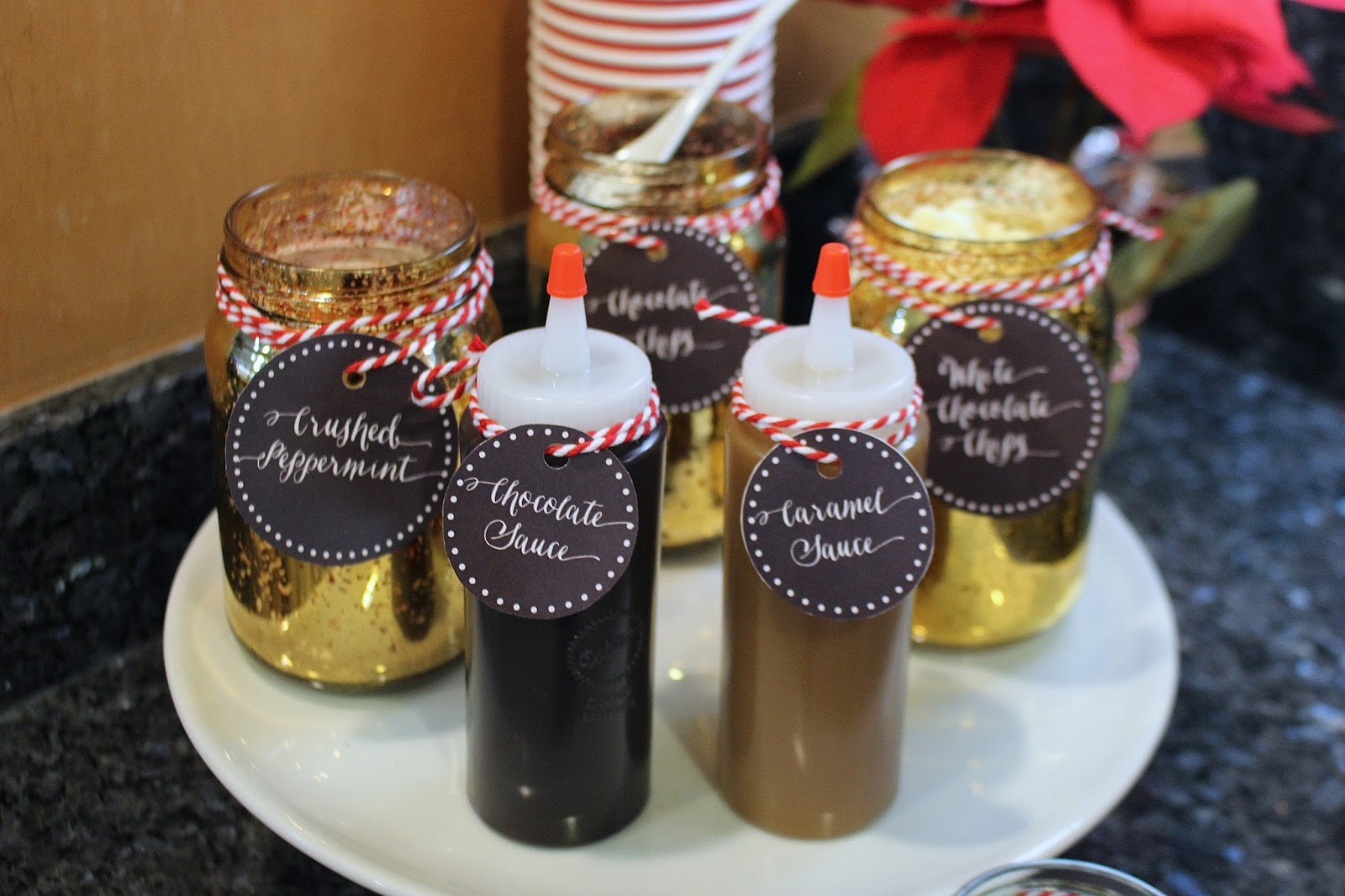 The little squeeze bottles were also purchased there for the chocolate and caramel sauce. In the gold mason jars I put white chocolate chips, regular chocolate chips, crushed peppermint, stir sticks and straws. When I took the pictures I had forgotten to put out the mini marshmallows, but they were also in there. The hot chocolate was on the other side near the stove (not pictured).